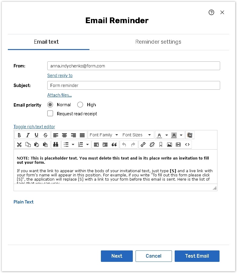 In the Email Text tab, compose your reminder message. For details consult the Compose Email help chapter.