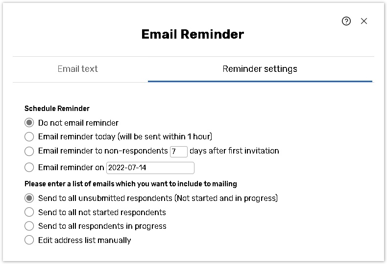 For example, a survey was launched on April 1. A reminder is set to go out in 10 days. Respondents, who did not submit the survey, will receive the reminder email on April 11. If you launched the survey once more to a different group of people on April 5th, these people would receive the reminder on April 15 - 10 days after they got their survey invitation.Select the Email reminder on option to email reminder on a specific date. To send email reminder today, use the Email reminder today option instead of setting the current date in this option.