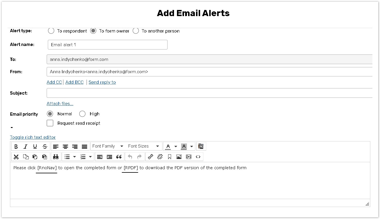 You can use tags in square brackets [ ] when editing your email invitation with the link to the online form and editing an Email alert message. These tags allow you to personalize your email or supply it with additional form or report links.