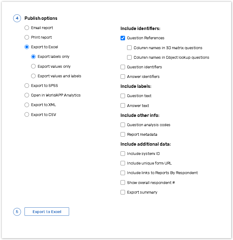Select Question References to insert a header row with the references to the questions either in the Qx.Ay.Cz format (where 'x' is the question number, 'y' is the answer number and 'z' is the column number, if applicable) or using the question identifiers, if there are any. If an identifier is applied to an answer, but not to its question, the question number is omitted from the header, and only the reference to the answer identifier is included. If the Question References option is selected, two additional settings appear: