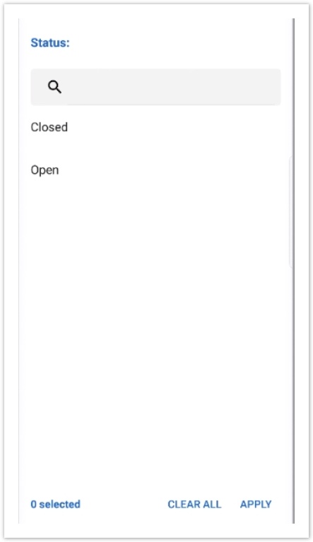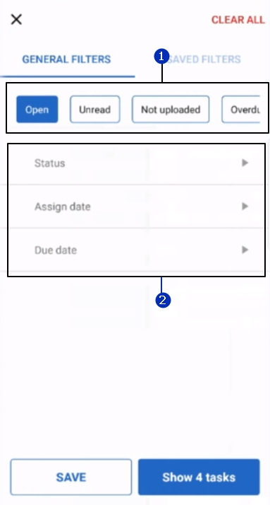 ![]() | 1. Quick filters shown as chips at the top of the filters page. By default, quick filtering by the Open status is applied. 2. Configurable filters are shown as the list of selectable parameters e.g. Status, Due date, Assign Date or custom properties created by the Portal admin. |