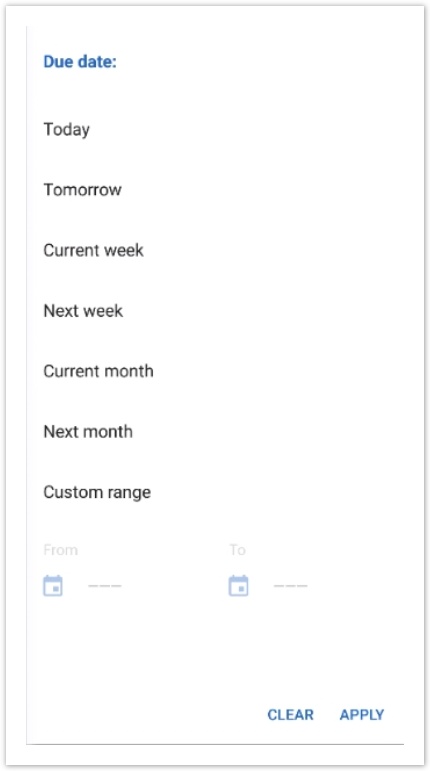 The date filter parameter corresponds to the field with the Due date and for which only one value or range can be applied.