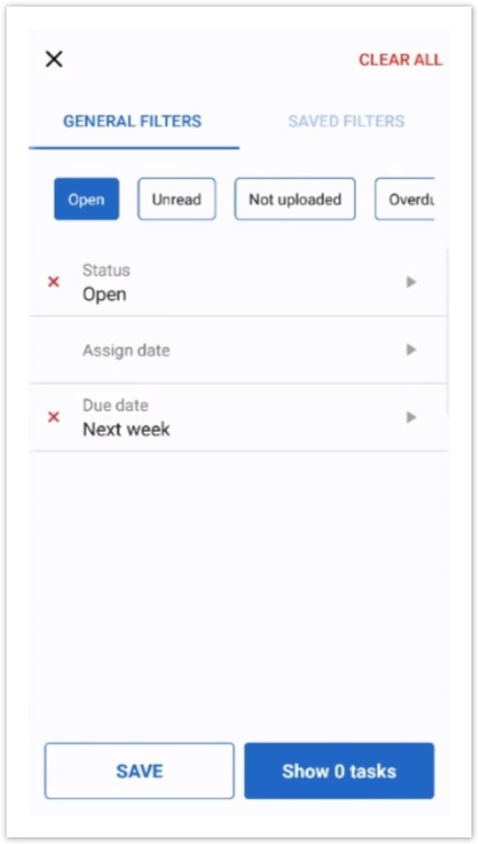 After you saved at least one filter set, the Saved Filters tab will appear in the Filter screen showing the list of presets with the number of tasks related to it.