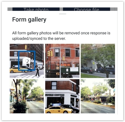 Allows a mobile app user to take multiple photos sequentially without following the form structure for the File Upload question type. All photos that you have taken are available in the Form Gallery.
