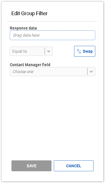 When selecting response data and the Contact Manager field, some combinations of their formats may be incompatible. For example, if the response data has a numeric format, and none of the columns in the Contact Manager is formatted as a number, the Contact Manager field dropdown will appear empty with the "Equal to" operator selected. In such cases you can choose a different operator or another combination of response data and Contact Manager fields.