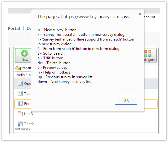 The following window with the list of available Hot Keys will appear over the Form/Survey page by clicking the "H" key: