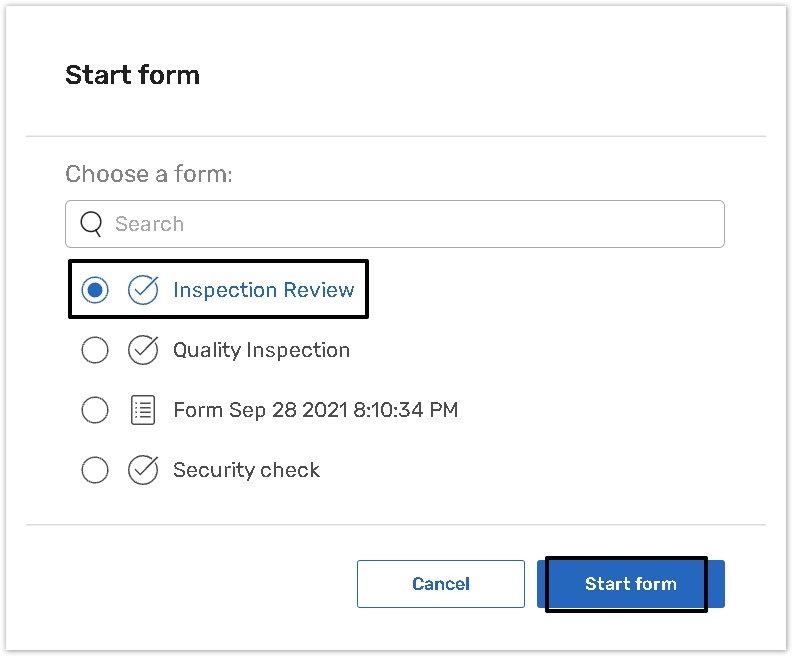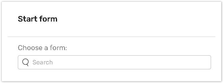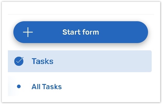 If you click the +Start form button from the specific Form or Task Definition page, the corresponding Form / Task Definition option will be chosen by default. Therefore, the Start form button will be active.