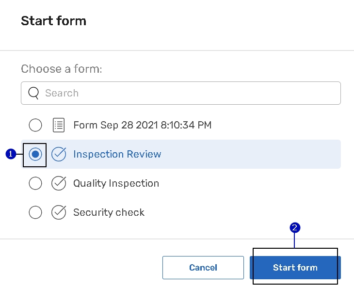 ![]() | Choose a task definition with a linked form (1) available for you from the Start form dialog. |