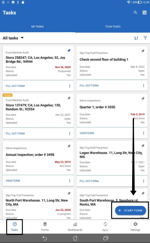 If you use an Android tablet, the "+" button is displayed as the + Start form button.