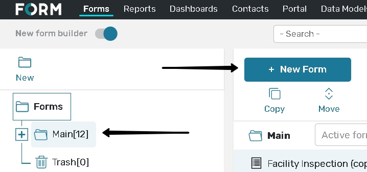 On the Folders Panel on the left of your screen you can create custom folders for different forms to keep them structured and ordered in the way you need. By default you will use the Main folder to create your first form.