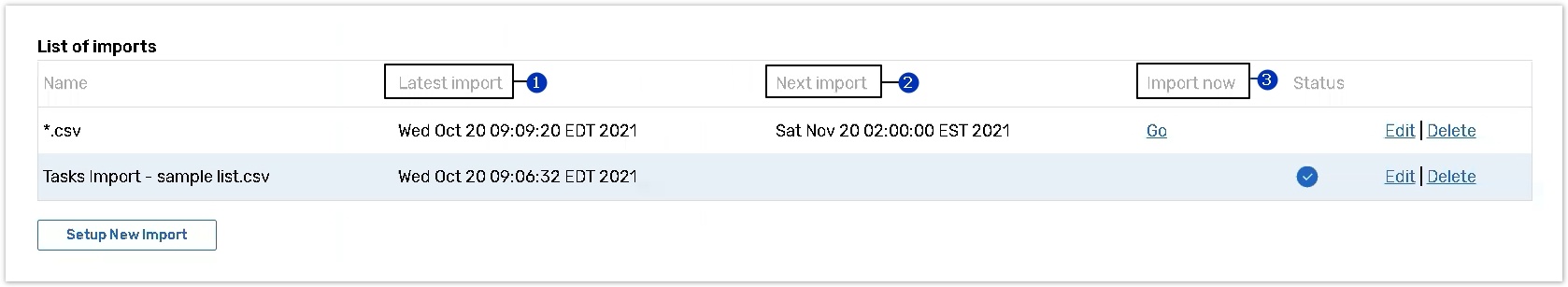 The Next import (2) column displays the date and time for the task import that you arranged.