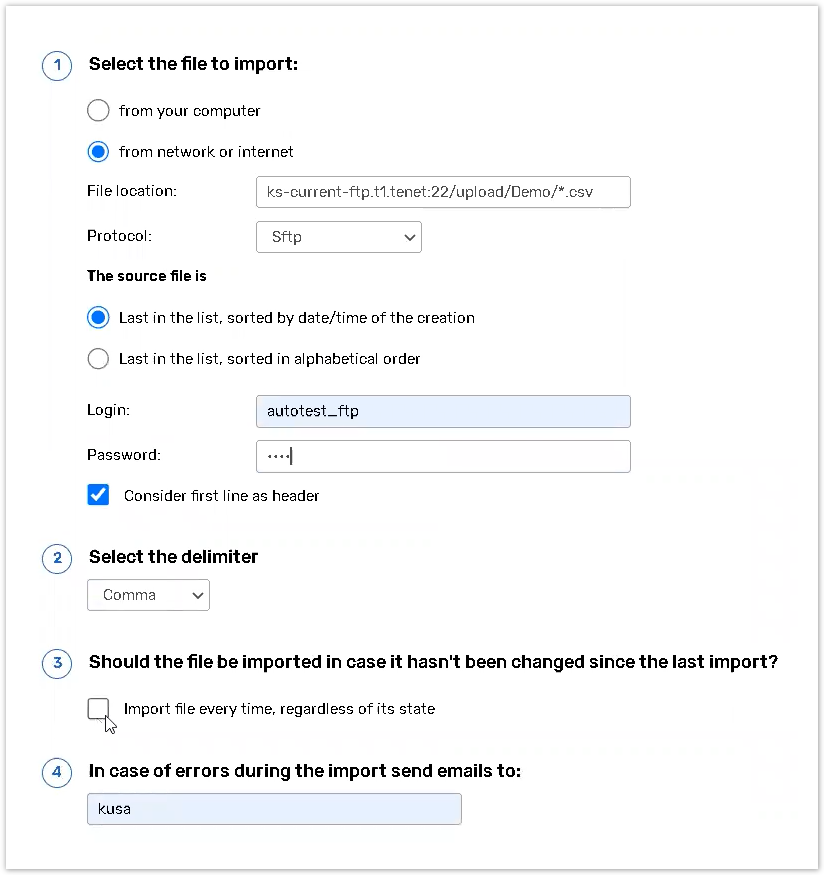 Specify an email in case of errors during the import emails to be send to (the setting is optional);