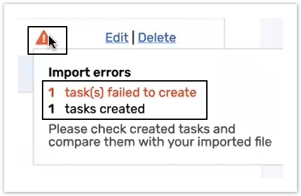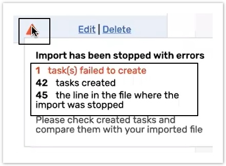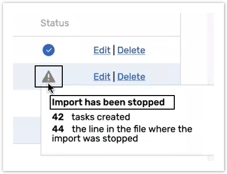The icon appears when the file import was stopped manually with errors. Hover over it to see the number of numbers of failed and imported tasks or objects and the number of a line where the import was stopped.