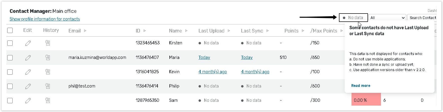 On the Contacts page you can see contacts' statistic info. It also displays data about the last sync/upload of contacts from their mobile devices.