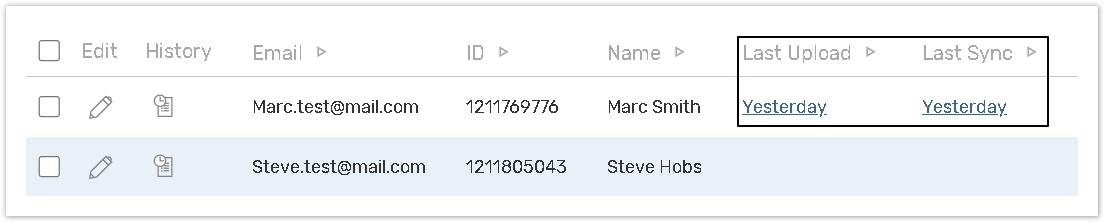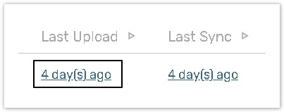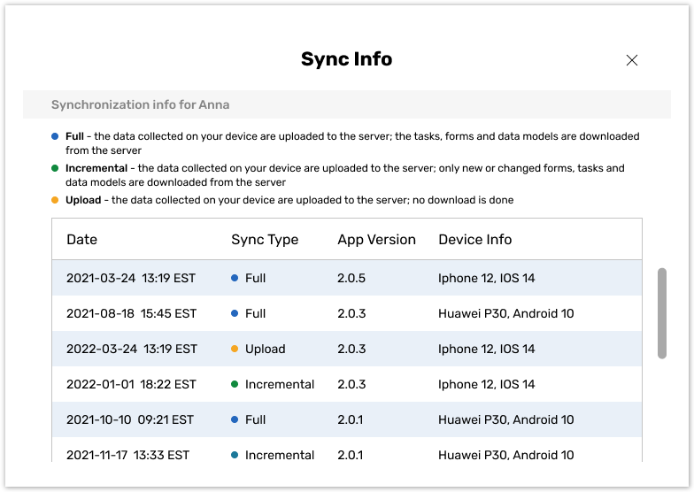 The Last Upload column displays the date when a Contact uploaded their last data from a mobile device to the server. The Last Sync column displays the date when a Contact downloaded forms, task definitions, and data models last time.