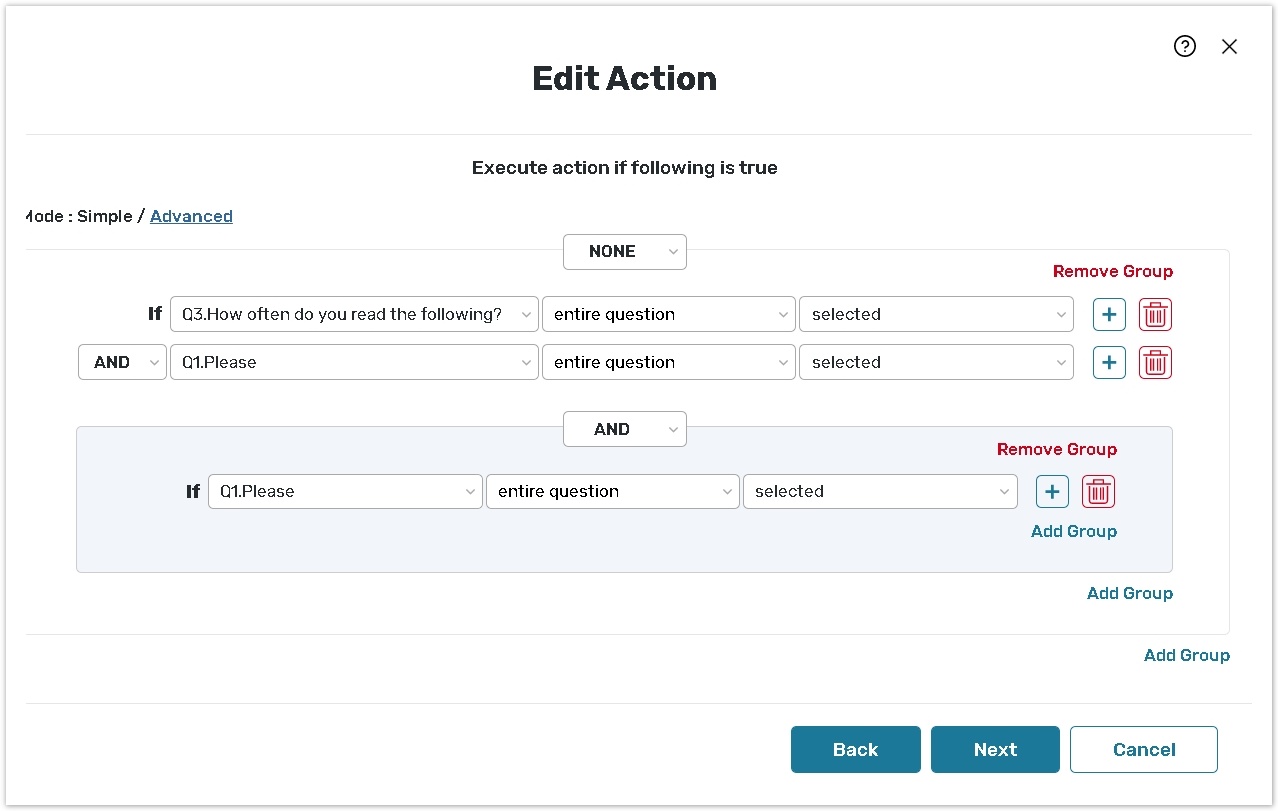 If you use simple mode to implement logic rules, be careful when using checkboxes to select needed questions: