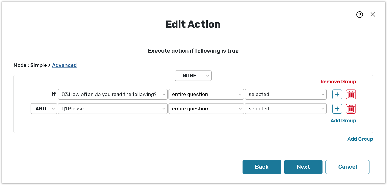Several logical conditions may be used here by clicking on Add Group. Remove group is used for deleting logical conditions. Hit Next when done.