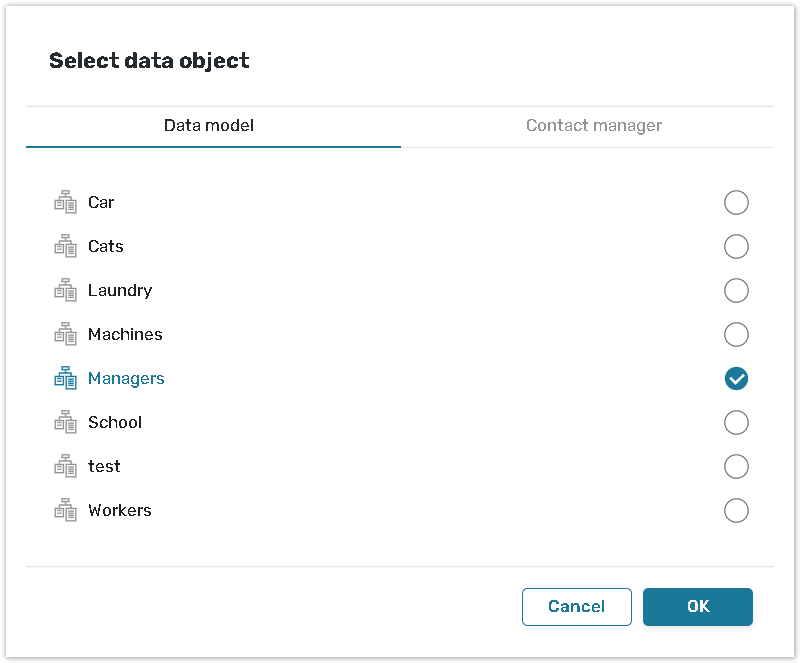Choose one of the Data sources (Data Model or Contact Manager), and select the Data object;