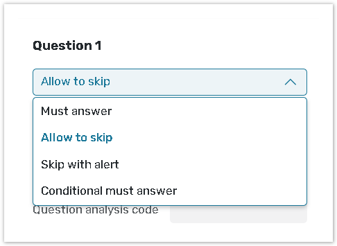 Skip with alert: This option allows respondent skipping a question but generates a pop-up alert that notifies about skipping the question.