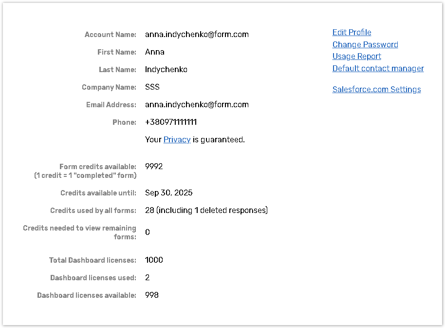 Name, Company Name, Email Address, Phone You can view the information you entered into the corresponding fields while signing up.
