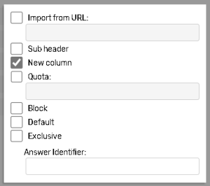 The New Column feature separates the list of answer choices into columns for better question appearance and usability. In some questions which contain a long list of answer choices, the respondents will need to scroll up and down to locate the answer they want to select. If you have a list of items respondents must check and you want these items to be grouped by certain criteria, create sub headers for each criteria.