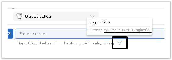 "In" and "Not in" conditions allow to check whether the value, stored in the Data Model or Contact manager is/is not among several values, located within the general or numeric question field. Numerous options can be specified in a form field with the help of divider |. For example, if one of the columns in your Contact Manager or Data Model stores numbers from 1 to 5, and in your Object Lookup question you wish to show only those data objects which have the value of 1, 3 or 5, you may set up a filter based on the Single line question to which the value: 1|3|5 can be set. The Single Line question may be hidden and prepopulated with the help of Set Value feature or Data Flow.