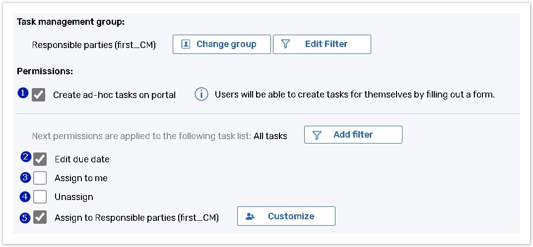 The functionality controls which portal users should have access to tasks through the Task Management functionality. It also determines if they can view and re-assign such tasks using complex filters that would allow to define user groups to apply the permissions for, define permissions and in case of re-assigning, define for which groups of users the reassignment is possible.