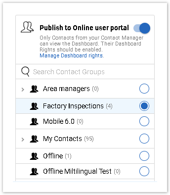 A Dashboard can be published to Contacts who have Dashboard rights. They will be able to view Dashboards on the Online Portal.