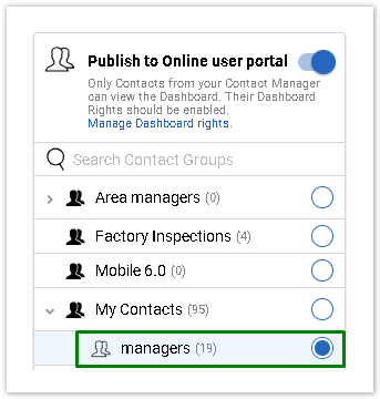 You can publish the Dashboard to an existing Contact Manager Group. To see the existing groups, expand the Contact Manager.