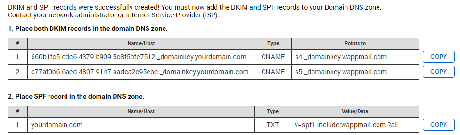 Once DKIM and SPF records are generated, please contact your system administrator or refer to this help page to correctly add them to your domain's DNS settings.