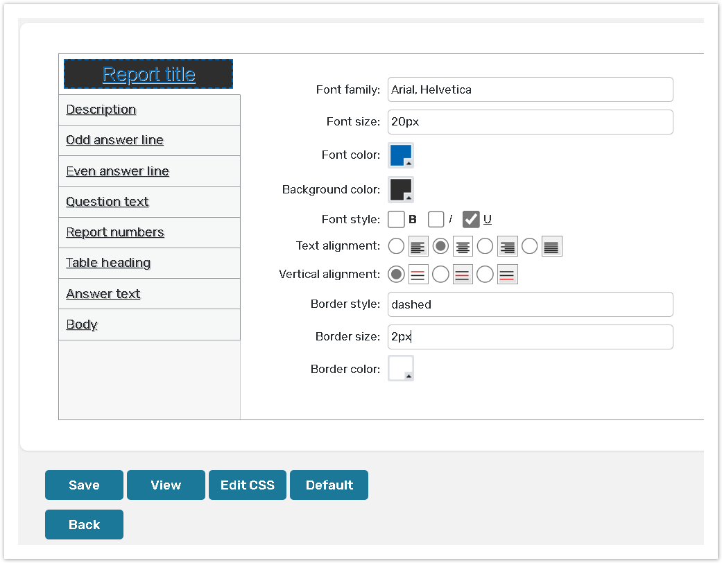 Click the Edit CSS button to edit CSS parameters of your report. For more details consult the CSS Parameters help chapter.