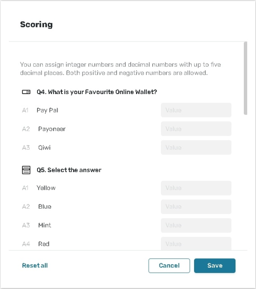 A Scoring window will be displayed. The dialog displays a list of questions (+their icons) and their answer options available for the Scoring function.