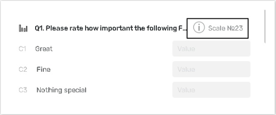 For the Rating Scale question type, the chosen Scale is displayed next to the question name in the 'Scale №' format. The 'N' stands for the scale numeric position in the general list of scales for Rating scale questions.