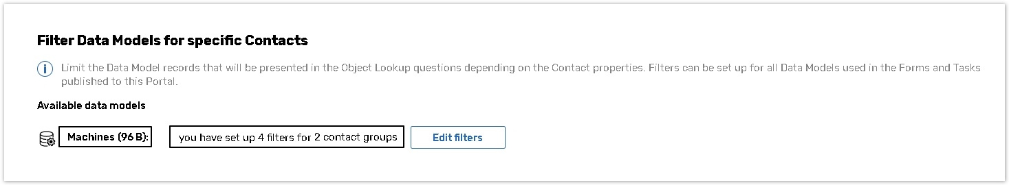 At the bottom of the Portal Settings page, you will see a list of Data Models currently used in Forms and Tasks which are published to the Portal. You can also see the size of the Data Model, as filters will be useful for large Data Models in particular.