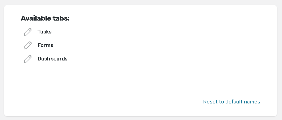 Use this section to custom names of the forms, tasks and dashboard tabs that will be visible to the user on the Portal.