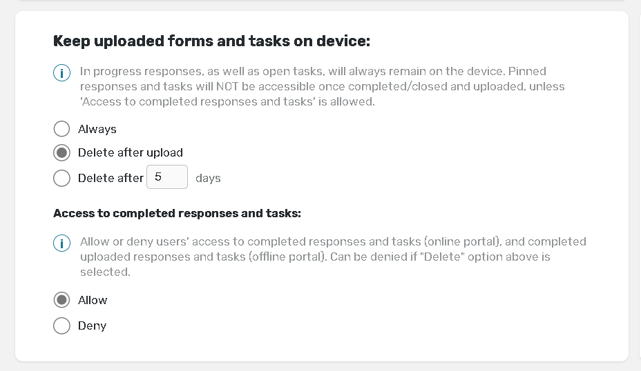 This feature allows controlling whether Completed and Uploaded responses and tasks should stay on the device after upload or not. Responses or tasks may be removed from the device either immediately after uploading to the server or after a specified number of days. If you choose the option Always they will stay on the device.