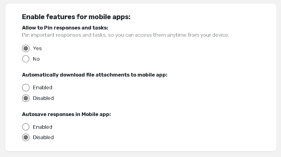 Once a response or a task is pinned, its data with attachments will never be removed from the mobile device. The pinned response will be placed at the top of the list and all pinned responses will be sorted by submit date.