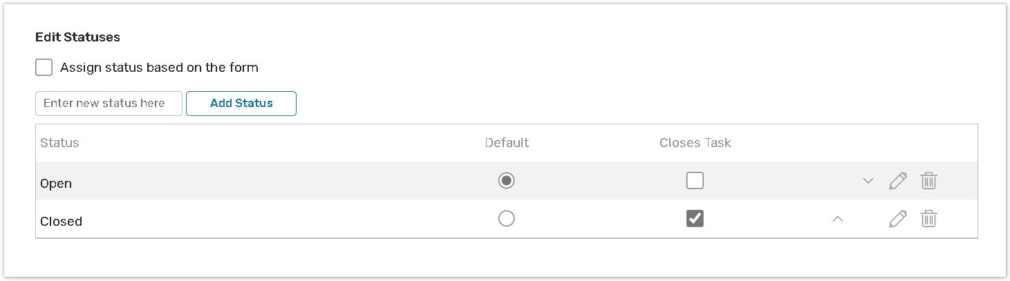 Closed status is marked as such that closes the task. You may edit and delete statuses labels by clicking on the pencil icons.