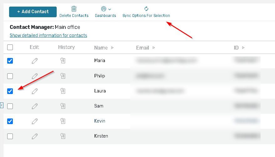 5. If you need to edit the sync options or send the push notification in a bulk, choose the contacts you need in the list and use the ‘Sync options for selection’ button in the header.