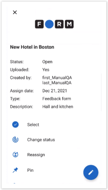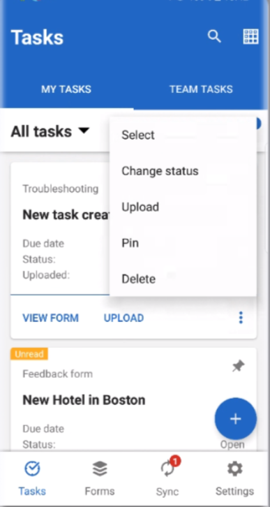 Tap the More Options button at the bottom right corner of a task card to view a list additional actions that can be performed on a particular task, such as: Select, Pin, Change Status, Change Due Date, Reassign, Unassign: