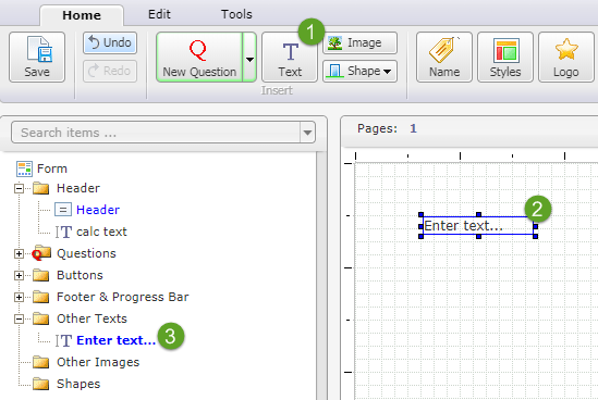Click the Text button (1) on the Home tab and then type your text into the text box (2) that appears.