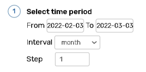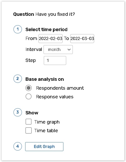 ![]() | Define the time period you want to view the response statistics (to a particular question) using the From and To calendar menus. Make sure your 'To' date is not before your 'From' date. Use the Interval dropdown menu to break down time periods into years, quarters, months, weeks and days. The overall length of an interval should be shorter than the whole time period selected. Use the Step text box to set the interval pacing. For example, if you chose a time period of 1 month, an interval of a week and your interval step is '2', then you will have two intervals, each interval is 2 weeks long. |