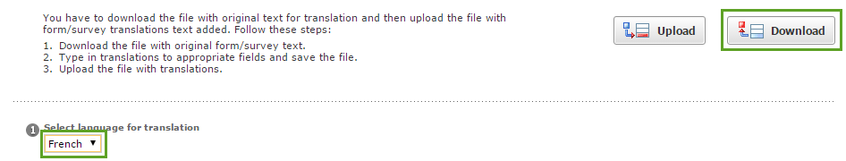 On the "Form translation" page select the language for translation and click "Download" button to export the file with form original structure and text.