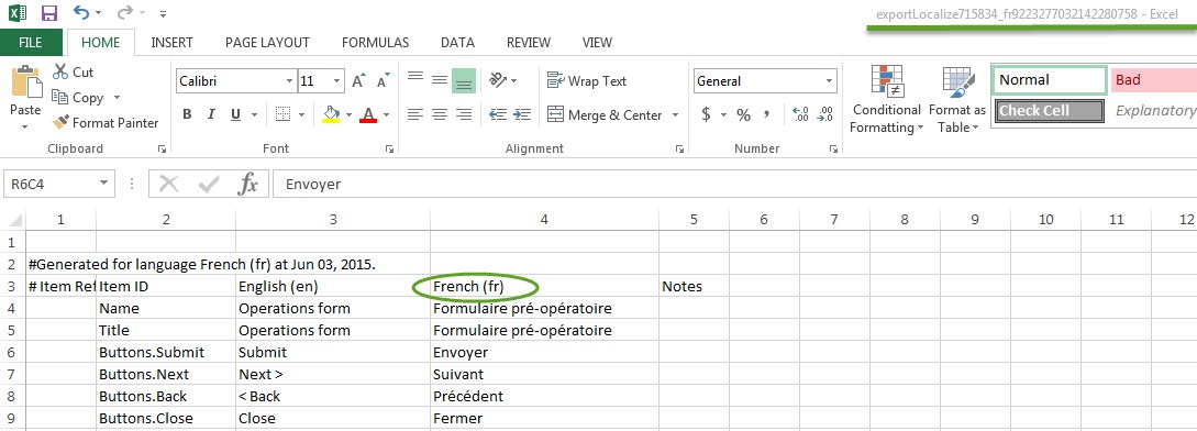 3. Open downloaded file via Excel, type in form/survey text translation into the appropriate fields (the column with the language name, i.e.for English it is en, Ukrainian is uk ):