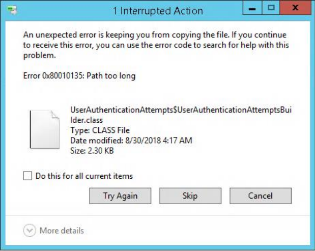 If you receive an error “Path too long” while copying the files, you can try using a third-party archiver (for instance 7-zip)