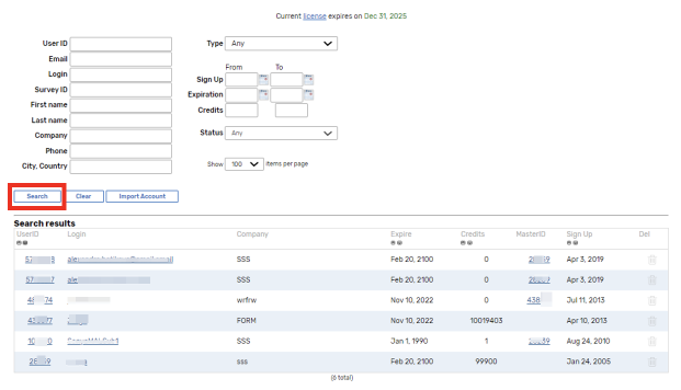 The Administration account allows you to search, edit user accounts, change the account type, expiration date, add or withdraw credits.