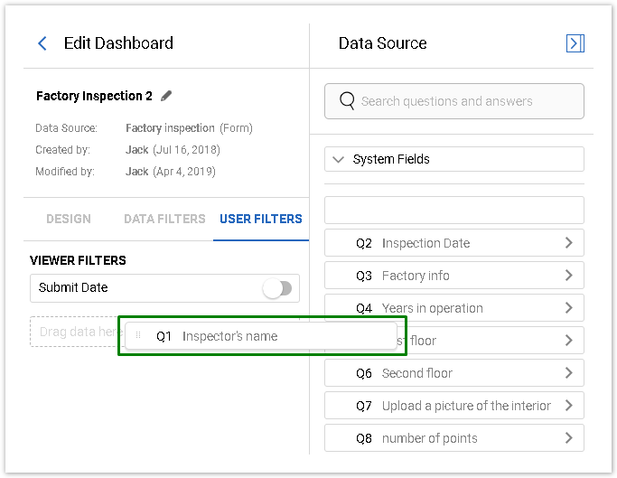 You can drag questions, their parts, or system fields to the Filter panel to create a filter. Compatible fields will have the following indicator next to them: