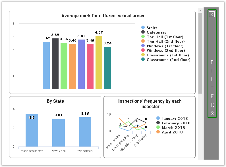 The configured filters will appear on the Filters tab in the Dashboard Preview mode, and the dashboard viewer will be able to apply them in real time: